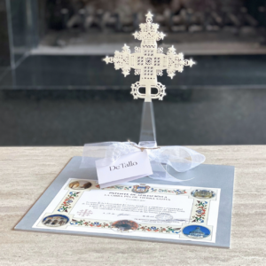 Tabla con Cruz de acrílico nacarado y certificado de Misa Perpetua.