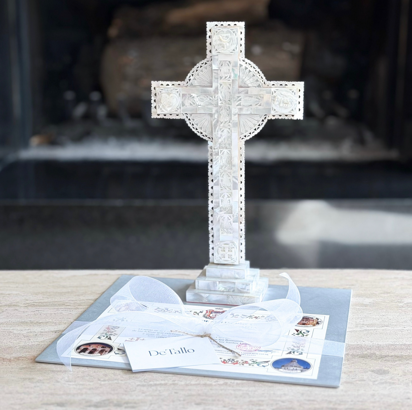Cruz hecha a mano por familias cristianas en Belén a base de madera de Olivo y Concha Nácar. Con certificado de Misa Perpetua.